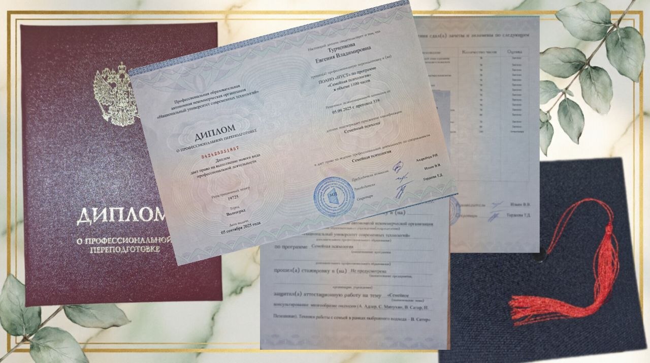 ДИПЛОМ О ПРОФЕССИОНАЛЬНОЙ ПЕРЕПОДГОТОВКЕ Семейная психология Год окончания: 2023 Тема выпускной работы: «Семейное консультирование: многообразие подходов (А. Адлер, С. Минухин, В. Сатир, Н. Пезешкиан). Техники работы с семьей в рамках выбранного подхода – В. Сатир» Профессиональная переподготовка по направлению «Семейная психология» -это глубокие знания и практические навыки для работы с семейными системами: Семейное консультирование — помощь парам в преодолении кризисов В рамках выпускной квалификационной работы использовала подходы великих семейных терапевтов: Альфреда Адлера, Сальвадора Минухина, Вирджинии Сатир и Носсрата Пезешкиана. Особое внимание уделила гуманистическому подходу Вирджинии Сатир — её техникам коммуникации, работе с самооценкой членов семьи и созданию атмосферы принятия и доверия. Эти знания помогают сопровождать клиентов в решении сложных вопросов семейной жизни, находить пути к взаимопониманию и гармонии. Счастливая семья — основа счастливой жизни каждого её члена. Семейный психолог — профессия, которая меняет жизни к лучшему! |