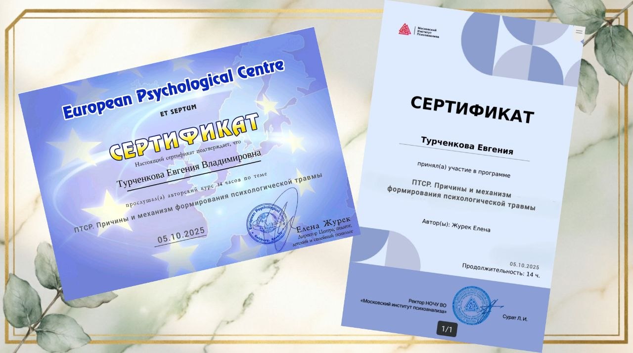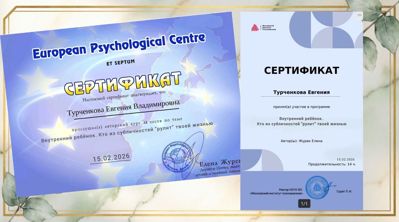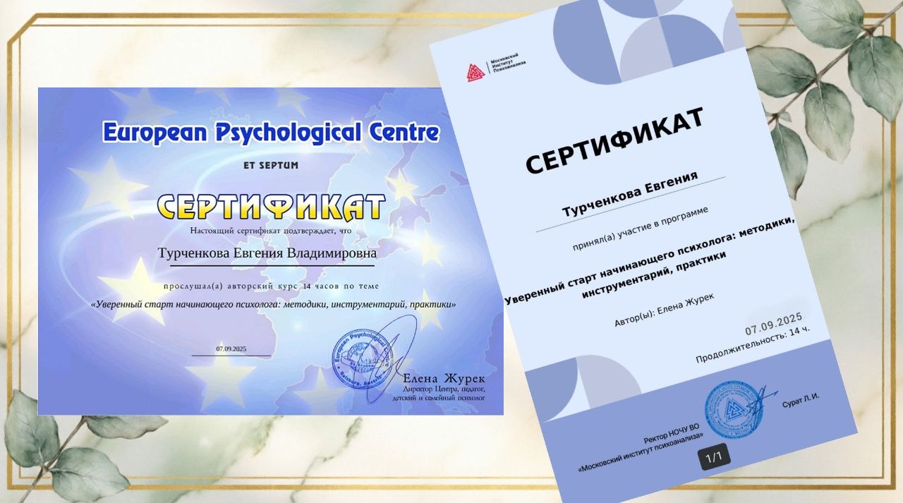 Мои дипломы, сертификаты и награды — это карта моего профессионального пути. Это подтверждение того, что я инвестирую время и силы в свое развитие, чтобы вы получали помощь высшего качества.