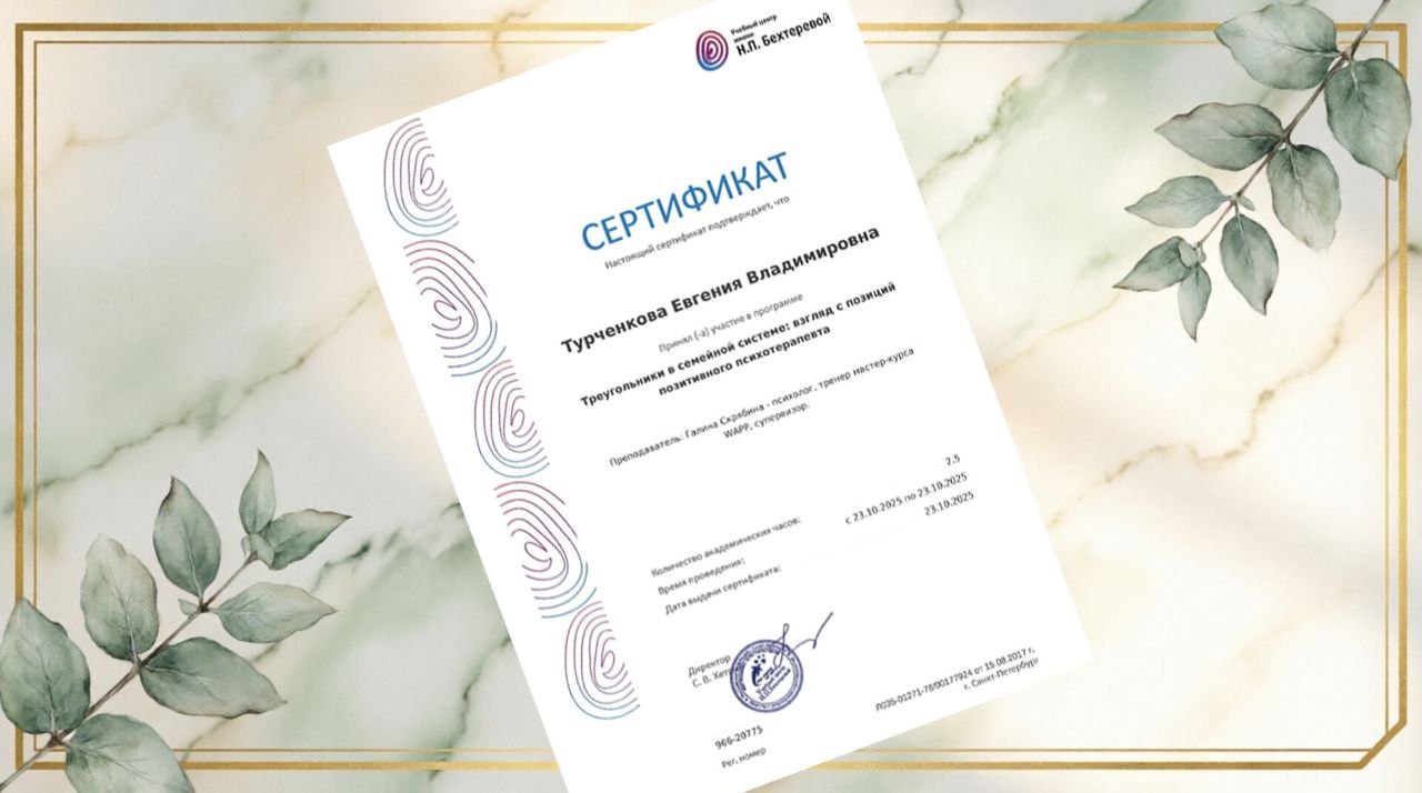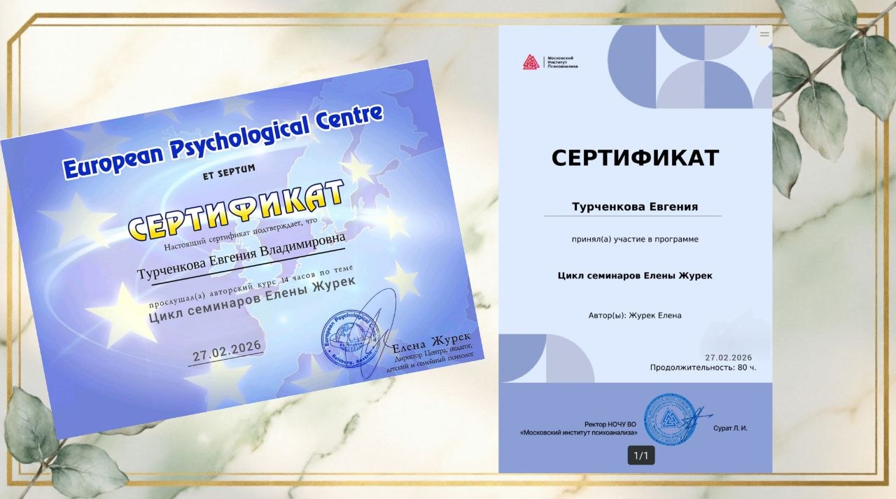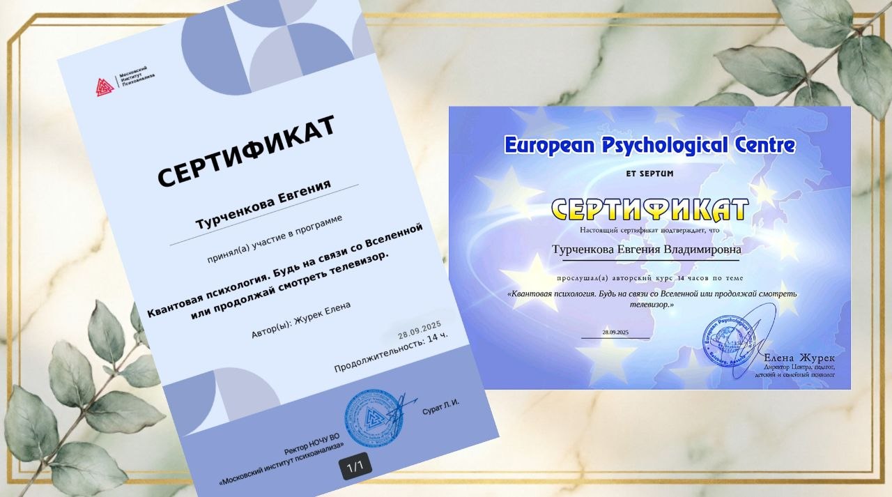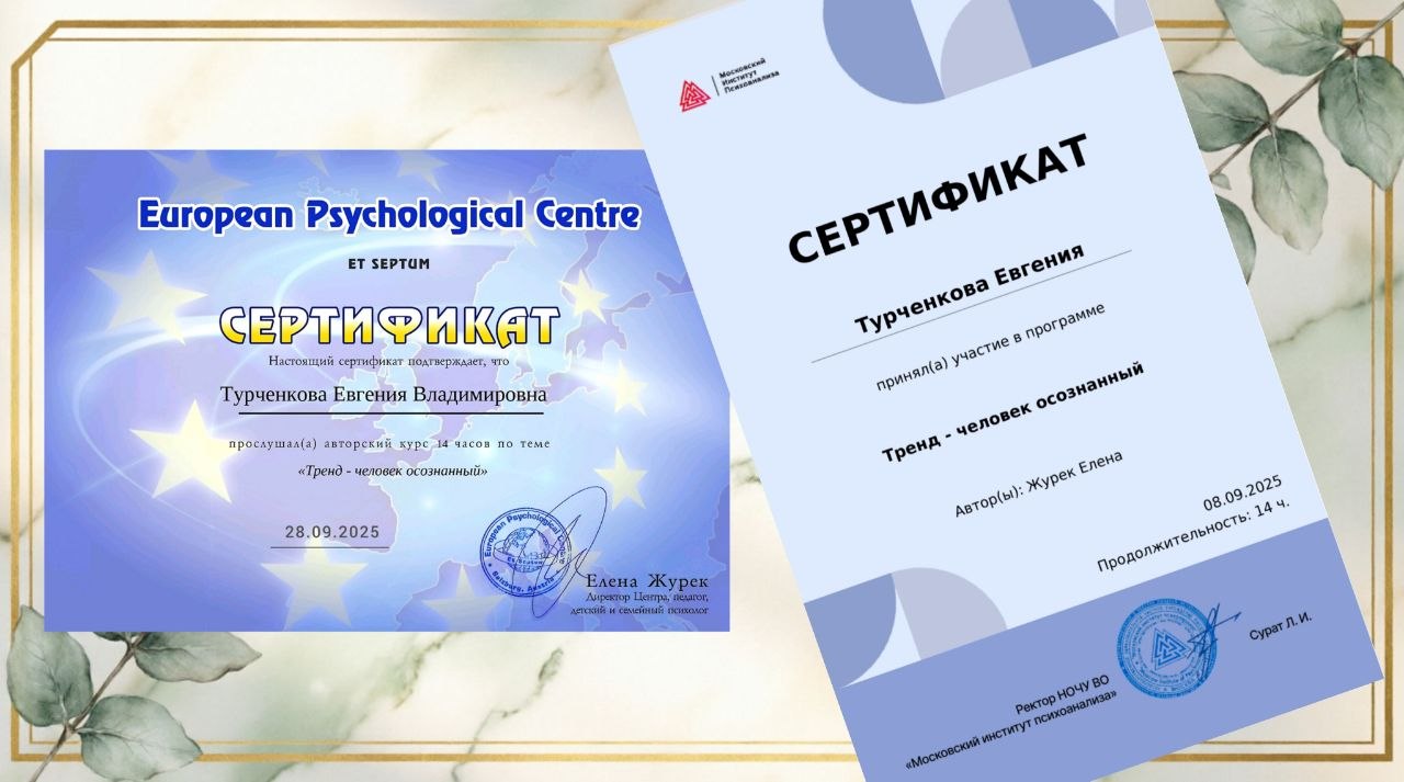 Мои дипломы, сертификаты и награды — это карта моего профессионального пути. Это подтверждение того, что я инвестирую время и силы в свое развитие, чтобы вы получали помощь высшего качества.
