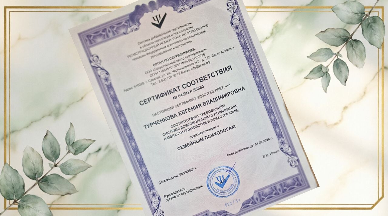 Семейный психолог Номер: № 64.RU.P.55580 Подтверждение квалификации Сертификат подтверждает соответствие требованиям системы добровольной сертификации в области психологии и психотерапии. Квалификация: Семейный психолог Документ гарантирует: Официальное подтверждение профессионализма! |