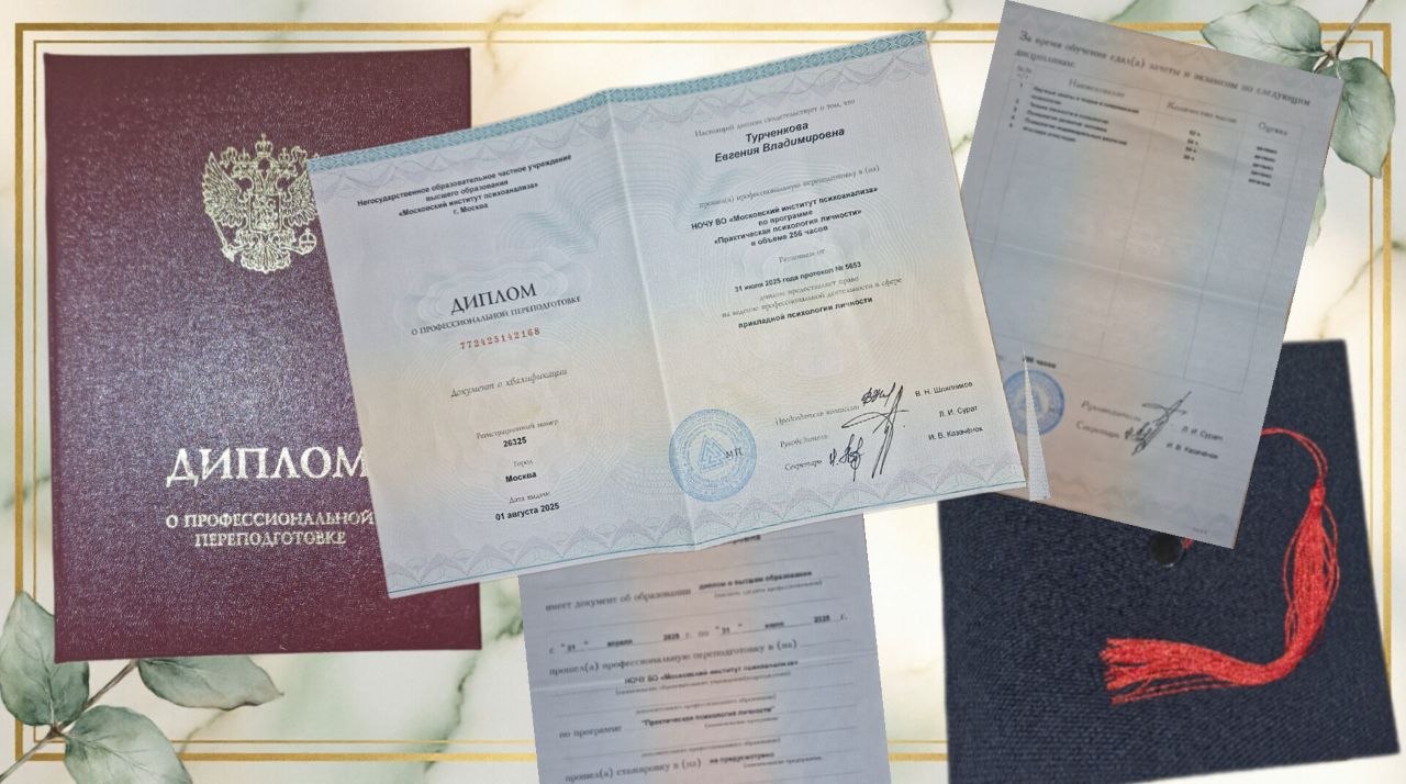 ДИПЛОМ О ПРОФЕССИОНАЛЬНОЙ ПЕРЕПОДГОТОВКЕ Практическая психология личности Год окончания: 2025 Практическая психология личности — глубокое понимание человеческой природы Профессиональная переподготовка по направлению «Практическая психология личности» позволила мне получить фундаментальные знания о механизмах функционирования человеческой психики: Научные школы и теории в психологии личности — изучение классических и современных подходов к пониманию личности Эти знания дают мне возможность: Понимание личности — ключ к эффективным изменениям! Прикладной психолог личности — специалист, который помогает человеку познать себя! |