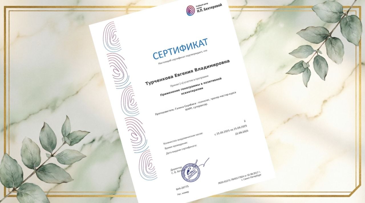 Мои дипломы, сертификаты и награды — это карта моего профессионального пути. Это подтверждение того, что я инвестирую время и силы в свое развитие, чтобы вы получали помощь высшего качества.